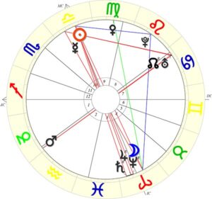 Das Horoskop am Tag der Einweihung, hier mit einer hypothetischen Zeit um 12 Uhr mittags, zeigt einen Vollmond auf der Widder-Waage-Achse und eine weite Konjunktion von Saturn und Neptun (mit Jupiter) im Widder, ein hoffnungsfrohes Zeichen für die im Februar 2026 stattfindende exakte Konjunktion dieser beiden Langsamläufer auf 0 Grad Widder.